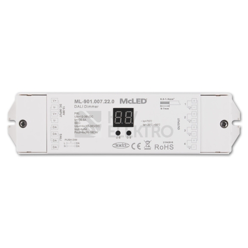 DALI přijímač pro řízení jasu (stmívání) jednobarevných LED pásků, řízení RGB LED pásků a změnu teploty chromatičnosti CCT LED pásků (DALI master ovladač není součástí). Rozměry: 170x53,4x28mm. Vstupní napětí: DC 12-36V. 4 kanály s max. zátěží 5A na 1 kanál ( = jedna barva R/G/B/W): 60W/12V, 120W/24V, 180W/36V. Funkce push-dim. Lze nastavit 1 - 4 adresy.