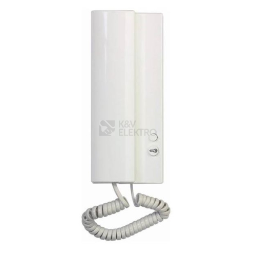 Domácí telefon ELEGANT bílý s elektronickým vyzváněním. 1 ovládacím tlačítkem a 1 tlačítkem pro protistanici Typ zdroje 4FP 672 55 Technické parametry: rozměry 82x197x48,6mm Provozní prostředí +5°C až 40°C, Bez bzučáku, pouze elektronické vyzvánění Napájení z audiosystému 4+n
