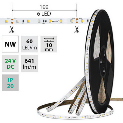 LED pásek SMD2835, neutrální bílá (4200K), 7,2W, 60LED, 641lm/m, CRI>90, segment 100mm, 6LED/segment, IP20, DC 24V, životnost 54000h, šíře 10mm, bílý PCB pásek, max. délka pásku při jednostranném zapojení: 20m, opatřen samolepící páskou 3M, UV stabilní. Balení 50m.