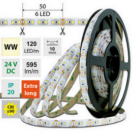 LED pásek SMD2835, teplá bílá (3000K), 7W, 120LED, 595lm/m, segment 50mm, 6LED/segment, IP20, DC 24V, životnost 54000h, šíře 10mm, bílý PCB pásek, max. délka pásku při jednostranném zapojení: 10m, opatřen samolepící páskou 3M, UV stabilní. Délka v balení: 50m.