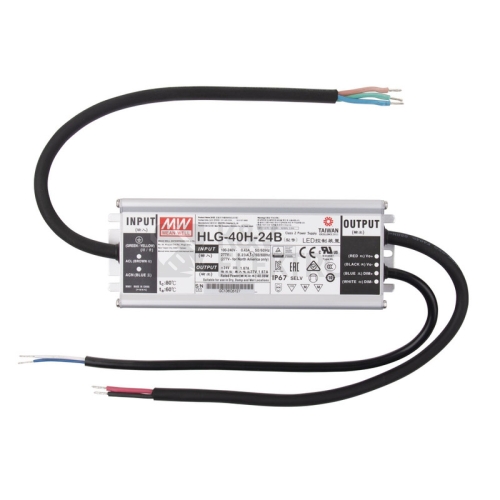 LED stmívatelný zdroj 40W, typ Mean Well HLG-40H-24B. Stmívání signálem 1-10VDC, PWM, proměnným odporem (100kohm). Krytí IP67, výstup 24VDC, 1,67A. Vstup: 90-305VAC, 47-63Hz, účinnost > 88%, PF > 0,95, materiál krytu: hliník. Rozměry: 171x61,5x36,8mm, hmotnost: 730g. Při volbě zdroje počítejte s výkonovou rezervou min. 20%.