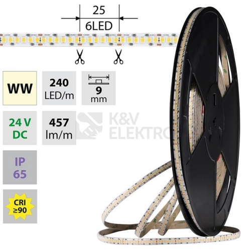 LED pásek SMD2835, teplá bílá (3000K), 6W, 240LED, 457lm/m, CRI>90, segment 25mm, 6LED/segment, IP65, DC 24V, životnost 54000h, šíře 9mm, bílý PCB pásek, max. délka pásku při jednostranném zapojení: 10m, opatřen samolepící páskou 3M, UV stabilní. Balení 10m.