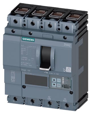 Výkonový jistič 3VA2, vel. 100, vyp. schopnostC Icu=110kA 415V 4-pól., ochrana strojního zařízení ETU850, LSI, In=100A, ochrana proti přetížení Ir=40A... 100A, ochrana proti zkratu Isd=0,6..10x In, Ii=1,5. .12x In ochrana N vodiče lze nastavit (VYP, až do 100%), svorková přípojka