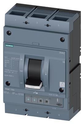 Výkonový jistič 3VA2, vel. 1000, vyp. schopnost H Icu=85kA 415V 3-pól., ochrana strojního zařízení ETU350, LSI, In=800A, ochrana proti přetížení Ir=320A... 800A, ochrana proti zkratu Isd=1,5...10 x Ir, Ii=10 x In, šroubový plochý přívod