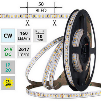 LED pásek SMD2835, studená bílá (6000K), 19,2W, 160LED, 2617lm/m, CRI>90, segment 50mm, 8LED/segment, IP20, DC 24V, životnost 54000h, šíře 10mm, bílý PCB pásek, max. délka pásku při jednostranném zapojení: 5m, opatřen samolepící páskou 3M, UV stabilní. Délka 5m.
