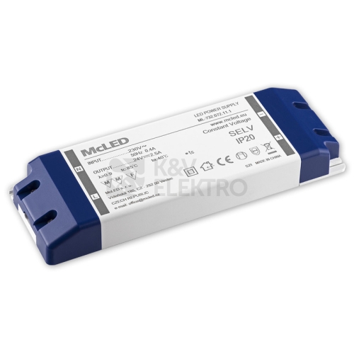 Kupte si napájecí zdroj pro LED pásky 24 V se středním výkonem od české značky McLED. Toto trafo je určené do interiérů, zajisté oceníte, že jej můžete instalovat na i do nábytku a dalších hořlavých materiálů. Při výběru napájecího zdroje se přibližně řiďte vzorečkem: výkon LED pásku x délka LED pásku + minimálně 20 %. Trafo pro LED pásky 24 V DC s výkonem 60 W a proudem 2500 mA je vyrobené z plastu a má rozměry 185 mm x 64 mm x 22 mm. Napájecí zdroj s označením SELV (bezpečné napětí) má stupeň krytí IP20 a disponuje vstupní a výstupní svorkovnicí. Trafo má certifikáty CE, RoHS, MM, F. Podívejte se na všechny napájecí zdroje pro LED pásky. Toto trafo slouží pro LED pásky 24 V, nabízíme i jiné LED pásky. K jejich instalaci se vám může hodit také hliníkový profil, difuzor, koncovky, příchytky nebo konektory. O výběru a instalaci LED pásku si můžete přečíst také na našem blogu. O společnosti McLED Společnost McLED s.r.o. je mladá česká firma, která se specializuje na kvalitní a úsporné LED osvětlení, se sídlem ve Vestci u Prahy. Kromě LED pásků McLED nabízí McLED také širokou škálu LED žárovek, svítidel na stěnu, vestavného osvětlení McLED či zářičů.