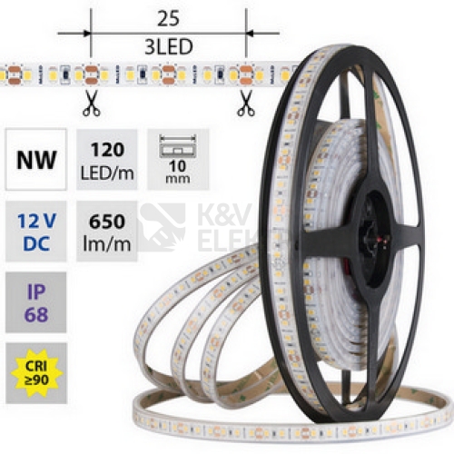 LED pásek SMD2835, neutrální bílá (4200K), 9,6W, 120LED, 650lm/m, CRI>90, segment 25mm, 3LED/segment, IP68, DC 12V, životnost 54000h, šíře 10mm, bílý PCB pásek, max. délka pásku při jednostranném zapojení: 5m, opatřen samolepící páskou 3M, UV stabilní. Balení 5m.