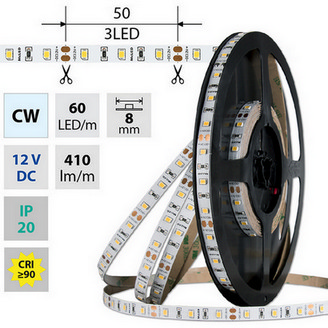 LED pásek SMD2835, studená bílá (6000K), 4,8W, 60LED, 410lm/m, CRI>90, segment 50mm, 3LED/segment, IP20, DC 12V, životnost 54000h, šíře 8mm, bílý PCB pásek, max. délka pásku při jednostranném zapojení: 5m, opatřen samolepící páskou 3M, UV stabilní.