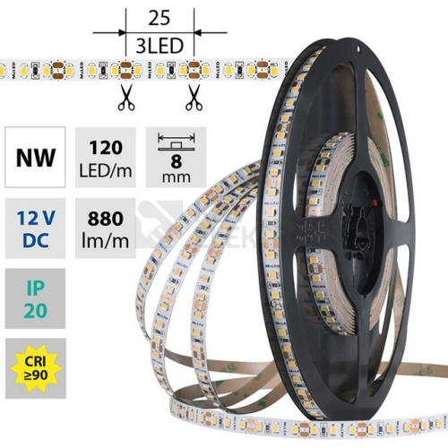LED pásek SMD2835, neutrální bílá (4200K), 9,6W, 120LED, 880lm/m, CRI>90, segment 25mm, 3LED/segment, IP20, DC 12V, životnost 54000h, šíře 8mm, bílý PCB pásek, max. délka pásku při jednostranném zapojení: 5m, opatřen samolepící páskou 3M, UV stabilní.