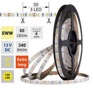 LED pásek SMD2835, extra teplá bílá (2700K), 4,8W, 60LED, 340lm/m, CRI>90, segment 50mm, 3LED/segment, IP54, DC 12V, životnost 53600h, šíře 8mm, bílý PCB pásek, max. délka pásku při jednostranném zapojení: 5m, opatřen samolepící páskou 3M, UV stabilní. Balení 5m.