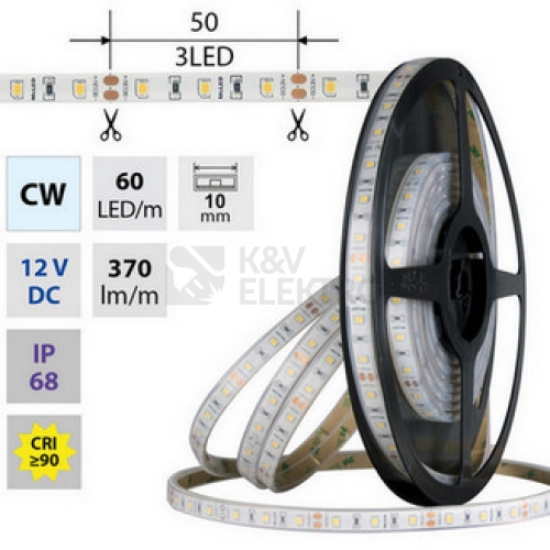 LED pásek SMD2835, studená bílá (6000K), 4,8W, 60LED, 370lm/m, CRI>90, segment 50mm, 3LED/segment, IP68, DC 12V, životnost 53600h, šíře 8mm, bílý PCB pásek, max. délka pásku při jednostranném zapojení: 5m, opatřen samolepící páskou 3M, UV stabilní. Balení 5m.