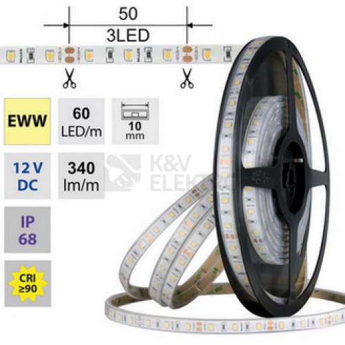 LED pásek SMD2835, extra teplá bílá (2700K), 4,8W, 60LED, 340lm/m, CRI>90, segment 50mm, 3LED/segment, IP68, DC 12V, životnost 53600h, šíře 8mm, bílý PCB pásek, max. délka pásku při jednostranném zapojení: 5m, opatřen samolepící páskou 3M, UV stabilní. Balení 5m.