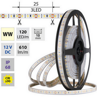 LED pásek SMD2835, teplá bílá (3000K), 9,6W, 120LED, 610lm/m, CRI>90, segment 25mm, 3LED/segment, IP68, DC 12V, životnost 54000h, šíře 8mm, bílý PCB pásek, max. délka pásku při jednostranném zapojení: 5m, opatřen samolepící páskou 3M, UV stabilní. Balení 5m.