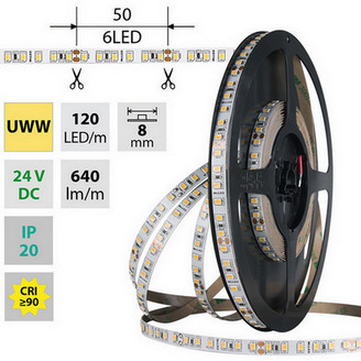 LED pásek SMD2835, ultra teplá bílá (2000K), 9,6W, 120LED, 640lm/m, CRI>90, segment 50mm, 6LED/segment, IP20, DC 24V, životnost 54000h, šíře 8mm, bílý PCB pásek, max. délka pásku při jednostranném zapojení: 10m, opatřen samolepící páskou 3M, UV stabilní. Balení 5m.