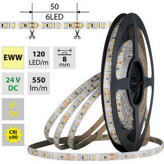 LED pásek SMD2835, extra teplá bílá (2700K), 9,6W, 120LED, 550lm/m, CRI>90, segment 50mm, 6LED/segment, IP54, DC 24V, životnost 54000h, šíře 8mm, bílý PCB pásek, max. délka pásku při jednostranném zapojení: 10m, opatřen samolepící páskou 3M, UV stabilní. Balení 5m.