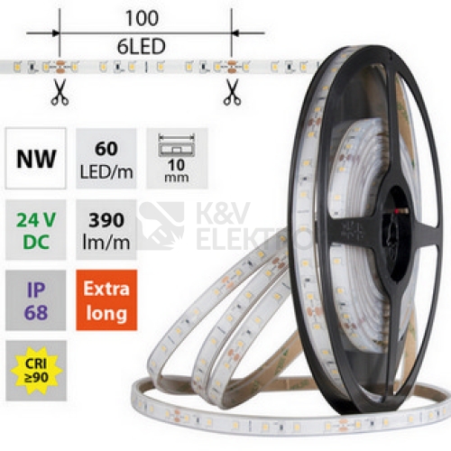 LED pásek SMD2835, neutrální bílá (4200K), 4,8W, 60LED, 390lm/m, CRI>90, segment 100mm, 6LED/segment, IP68, DC 24V, životnost 53600h, šíře 8mm, bílý PCB pásek, max. délka pásku při jednostranném zapojení: 10m, opatřen samolepící páskou 3M, UV stabilní. Balení 5m.