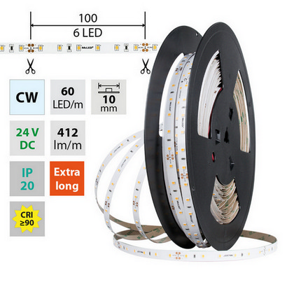 LED pásek SMD2835, studená bílá (6000K), 4,8W, 60LED, 412lm/m, CRI>90, segment 100mm, 6LED/segment, IP20, DC 24V, životnost 54000h, šíře 10mm, bílý PCB pásek, max. délka pásku při jednostranném zapojení: 20m, opatřen samolepící páskou 3M, UV stabilní. Balení 50m.