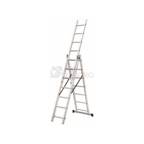 Výsuvný hliníkový žebřík 3 x 9 příček víceúčelový trojdílný žebřík po devíti příčkách lze sestavit jako stojací štafle, výsuvný nebo opěrný žebřík možnost nastavení výšky po jednotlivých příčkách opatřen jisticími pásy hliníkový žebřík dle normy EN 131 Kombinovatelný stojací a posuvný žebřík má různá použití. Lze jej použít jako stojací žebřík, stojací žebřík s nasazovacím dílem nebo 3dílný opěrný žebřík. max. výsuvná délka: 5,93 m šířka: 464 mm nosnost: 150 kg počet příček: 3 x 9