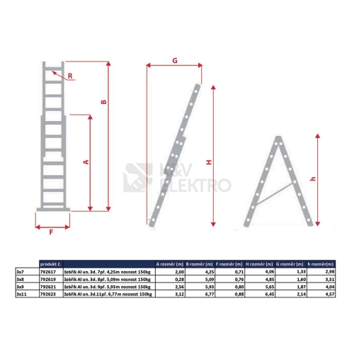 Výsuvný hliníkový žebřík 3 x 11 příček víceúčelový trojdílný žebřík po jedenácti příčkách lze sestavit jako stojací štafle, výsuvný nebo opěrný žebřík možnost nastavení výšky po jednotlivých příčkách opatřen jisticími pásy hliníkový žebřík dle normy EN 131 Kombinovatelný stojací a posuvný žebřík má různá použití. Lze jej použít jako stojací žebřík, stojací žebřík s nasazovacím dílem nebo 3dílný opěrný žebřík. max. výsuvná délka: 6,77 m šířka: 464 mm nosnost: 150 kg počet příček: 3 x 11