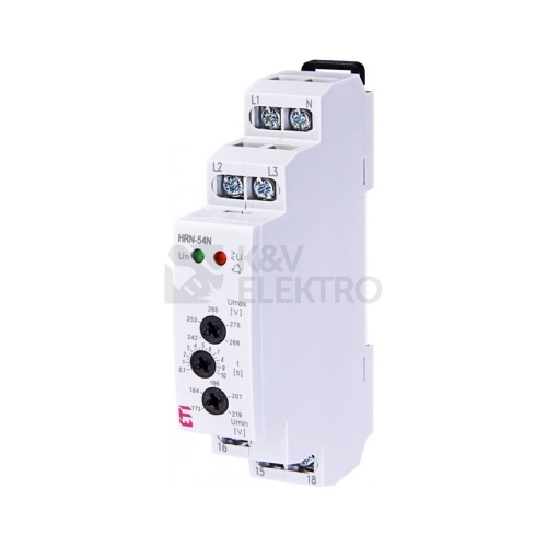 Hlídací napěťové relé ETI HRN-54N se používá ro hlídání napětí, sledu a výpadku fází v rozvaděči (ochrana přístrojů a zařízení). Monitoruje velikost napětí ve 3-fázové soustavě a hlídá sled fází. Napájení přístroje se provádí z hlídaného napětí. Pevná prodleva T1 (500ms) a nastavitelná prodleva T2 (0.1 – 10 s) pro eliminaci krátkodobých výpadků a špiček. Pokud napájecí napětí poklesne pod 60 % Un (UOFF spodní úroveň) dojde k okamžitému rozepnutí relé bez uplatnění zpoždění. Možnost nastavení horní a dolní hranici napětí, při které kontakt výstupního relé vypne. Je napájeno z L1-N, tzn. že relé hlídá i po přerušení nulového vodiče Chybový stav je indikován LED a rozepnutím výstupního kontaktu relé. TECHNICKÉ PARAMETRY Napájecí a hlídané napětí HRN-54N: 3 x 400V/ 230V horní úroveň (Umax): 105 – 125% hlídaného napětí spodní úroveň (Umin): 75 – 95% hlídaného napětí výstupní kontakt: 1x přepínací 8 A/250 V AC1 (AgNi, 250 0 VA) v provedení 1-MODUL, upevnění na DIN lištu