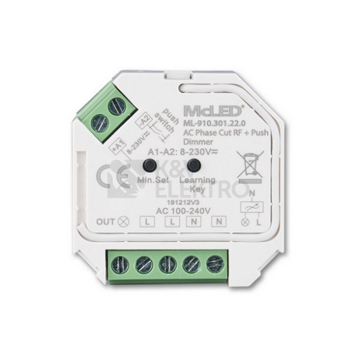 Přijímač k dálkovému RF ovladači pro stmívání svítidel napájených 230VAC (ovladač není součástí). Stmívá: klasické žárovky, halogenové žárovky, triakově stmívatelná svítidla (fázové stmívání na sestupné hraně - trailing edge dimming). Lze ovládat současně i libovolným tlačítkem. Rozměry: 45,5x45x20,3mm - vhodné k montáži do elektroinstalační krabičky. Vstupní napětí: 100-240VAC. Max. zátěž: 400W/1,5A.