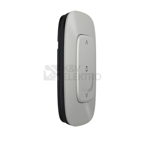 Valena Allure with Netatmo bezdrátový žaluziový spínač (baterie CR2032 a oboustranná lepenka součást balení) pro ovládání až 20 drátových žaluziových spínačů. Zadní strana je zcela plochá (lze montovat na zeď, sklo, nábytek pomocí šroubů nebo oboustranné lepenky) - barva Hliník, dodáván s rámečkem v barvě Hliník