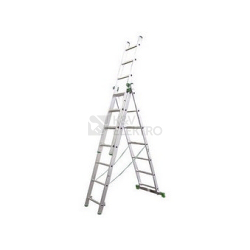 Délka: 5,69 m 9 příček materiál: Al Trojdílný opěrný žebřík 5,69 m je potřebný doplněk pro práci ve výškách doma i na zahradě, bez něhož se neobejde žádný kutil.