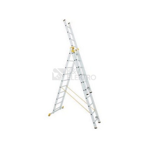 Délka: 6,95 m 10 příček materiál: Al Trojdílný opěrný žebřík 6,95 m je potřebný doplněk pro práci ve výškách doma i na zahradě, bez něhož se neobejde žádný kutil.