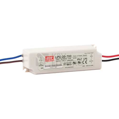 LPC-20 je série 20W AC/DC zdrojů s konstantním proudovým režimem a jedním výstupem. Tento konkrétní model poskytuje 700mA na výstupu. Je vhodný pro realizaci LED aplikací, i protože disponuje třídou ochrany II (bez FG pinu) a plně izolovaným plastovým krytem s vysokým stupněm krytí IP67. Technická data: Zdroj konstantního proudu Univerzální AC vstup Pně uzavřené provedení s krytím IP67 Odolnost průrazem 300VAC po dobu 5 sekund Proudová ochrana Napěťová ochrana UL1310 Třída 2 Kompaktní malé provedení Plně izolované plastové provedení těla Pasivní chlazení Nízká cena, dlouhá životnost Použití pro LED svítidla a signalizace