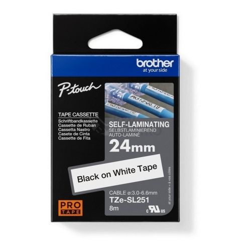 TZE-SL251: novinka v řadě PRO Tape pásek Brother - 24 mm široká SAMOLAMINOVACÍ páska bílá / černý tisk, vhodná pro značení optických, síťových a jiných elektro kabelů v rozmezí 3,0-6,6 mm jejich průměru. - 1/3 šíře pásky je určená k potisku – informaci o kabelu, zbylé 2/3 je průhledná část určená k ovinutí popisované 1/3 a tím ještě lepší ochraně popisu. - Použitelné do: PT-E550WVP, PT-E550WNIVP, PT-P900W, PT-P950NW, PT-D800W, PT-D600VP, PT-P750W a PT-P710BT (tyto tiskárny jsou připojitelné k PC/NB a lze využít náš BEZPLATNÝ software P-Touch Editor. V tomto programu (je dobré používat verzi „Professional“), přes ikonu „Tvorba kabelových štítků“ a pak „Samolaminovací“ vytvoříte štítek. Ikonu najdete v první liště nad pravítkem. U všech tiskáren kromě PT-D600VP lze tisknout i z mobilních aplikací iPrint&Label, Mobile Cable Label Tool. - Aby jste mohli tyto pásky používat, je potřeba k jednotlivým tiskárnám stáhnout aktuální – poslední verzi firmware zde: https://www.brother.cz/support/drivers - U tiskáren PT-E550xxx lze štítek vytvořit přímo na klávesnici tiskárny přes bílou klávesu „obal kabelu“. Najdete ji v horní části tiskárny a je to ta třetí bílá klávesa zleva sloužící pro funkci ovin kabelu.