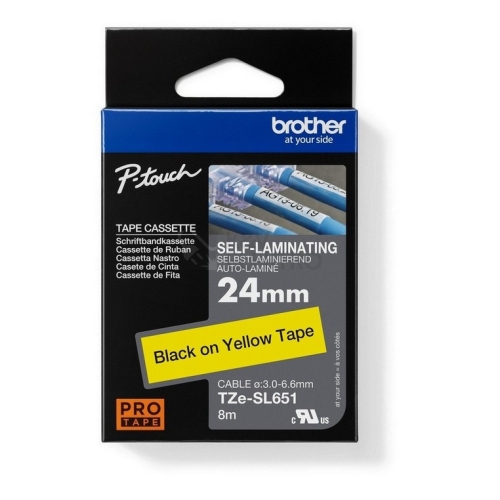 TZE-SL651: novinka v řadě PRO Tape pásek Brother - 24 mm široká SAMOLAMINOVACÍ páska žlutá / černý tisk, vhodná pro značení optických, síťových a jiných elektro kabelů v rozmezí 3,0-6,6 mm jejich průměru. - 1/3 šíře pásky je určená k potisku – informaci o kabelu, zbylé 2/3 je průhledná část určená k ovinutí popisované 1/3 a tím ještě lepší ochraně popisu. - Použitelné do: PT-E550WVP, PT-E550WNIVP, PT-P900W, PT-P950NW, PT-D800W, PT-D600VP, PT-P750W a PT-P710BT (tyto tiskárny jsou připojitelné k PC/NB a lze využít náš BEZPLATNÝ software P-Touch Editor. V tomto programu (je dobré používat verzi „Professional“), přes ikonu „Tvorba kabelových štítků“ a pak „Samolaminovací“ vytvoříte štítek. Ikonu najdete v první liště nad pravítkem. U všech tiskáren kromě PT-D600VP lze tisknout i z mobilních aplikací iPrint&Label, Mobile Cable Label Tool. - Aby jste mohli tyto pásky používat, je potřeba k jednotlivým tiskárnám stáhnout aktuální – poslední verzi firmware zde: https://www.brother.cz/support/drivers - U tiskáren PT-E550xxx lze štítek vytvořit přímo na klávesnici tiskárny přes bílou klávesu „obal kabelu“. Najdete ji v horní části tiskárny a je to ta třetí bílá klávesa zleva sloužící pro funkci ovin kabelu.
