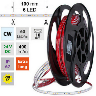 LED pásek SMD2835, studená bílá (6000K), 4,8W, 60LED, 400lm/m, CRI>90, segment 100mm, 6LED/segment, IP67, DC 24V, životnost 50000h, šíře 8mm, bílý PCB pásek, max. délka pásku při jednostranném zapojení: 10m, opatřen samolepící páskou 3M, UV stabilní. Balení 50m.