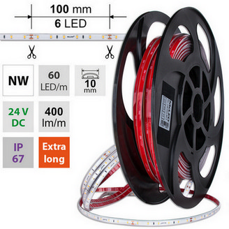 LED pásek SMD2835, neutrální bílá (4200K), 4,8W, 60LED, 400lm/m, CRI>90, segment 100mm, 6LED/segment, IP67, DC 24V, životnost 50000h, šíře 10mm, bílý PCB pásek, max. délka pásku při jednostranném zapojení: 10m, opatřen samolepící páskou 3M, UV stabilní. Balení 50m.