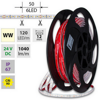 LED pásek SMD2835, teplá bílá (3000K), 14W, 120LED, 1040lm/m, CRI>90, segment 50mm, 6LED/segment, IP67, DC 24V, životnost 50000h, šíře 12mm, bílý PCB pásek, max. délka pásku při jednostranném zapojení: 5m, opatřen samolepící páskou 3M, UV stabilní. Balení 50m.