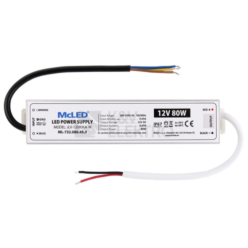 LED napěťový zdroj 80W pro LED pásky, krytí IP67, výstup 12VDC, 6,67A. Vstup: 185-250VAC, 50-60Hz, účinnost > 86%, materiál krytu: hliník. Rozměry: 193x41x24mm, hmotnost: 330g. Zdroj SELV. Při výběru zdroje počítejte s výkonovou rezervou min. 20%.