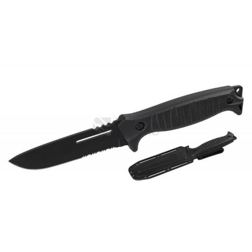 Moderní lovecký nůž 21 cm - outdoorový s pouzdrem nůž je vyroben z jednoho kusu nerezové oceli čepel s teflonovým povrchem, délka čepele 100 mm nylonová ergonomicky tvarovaná rukojeť s pohodlným úchopem otvor pro šňůru plastové pouzdro s pojistkou proti samovolnému vypadnutí nože s klipem na opasek a otvory pro přichycení na batoh