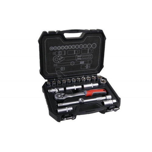 Kvalitní gola sada je vhodná díky kvalitě použitých materiálů a zpracování v profesionální autodílně nebo servisu. 10 let záruka. Všechny části jsou vyrobeny z vysoce kvalitní chrom-vanadiové oceli. Niklová povrchová úprava. Hroty bitů jsou ze slitiny oceli S2. Ráčny mají jemné dělení 72 zubů, tělo ráčny z CrV oceli, zubový mechanismus z S2 oceli, ergonomicky tvarovanou rukojeť se zdravotně nezávadnou gumou. Nový design plastového kufru z primárního materiálu s kovovými uzávěry a panty víka. Obsah sady: Ráčna: 1/2" / 72 zubů Prodloužení: 250 mm Trhák: 1/2" Hlavice nástrčné: 10 - 11 - 12 - 13 - 14 - 15 - 16 - 17 - 18 - 19 - 22 - 24 mm Hlavice nástrčné prodloužené: 17 - 19 mm Hlavice na svíčku: 16 - 21 mm Příslušenství: adapter, kloub