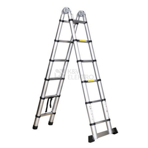 Žebřík teleskopický skládací hliníkový maximální délka 3,8 m (složený do podoby štaflí max. 1,9 m) 12 (6) příček maximální zatížení 150 kg umístění pod maximálním úhlem 25° stabilní a pevná konstrukce snadná manipulace - rozložení i složení pevné zámky jednotlivých příček kompaktní rozměry po složení jen 465 x 850 x 155 mm hmotnost 13.7 kg