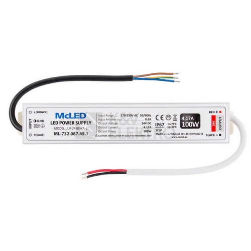 LED napěťový zdroj pro LED pásky 100W, krytí IP67, výstup 24VDC, 4,17A. Vstup: 170-250VAC, 50-60Hz, účinnost > 90%, materiál krytu: hliník. Rozměry: 218x40x22mm, hmotnost: 390g. Zdroj SELV. Při výběru zdroje počítejte s výkonovou rezervou min. 20%.