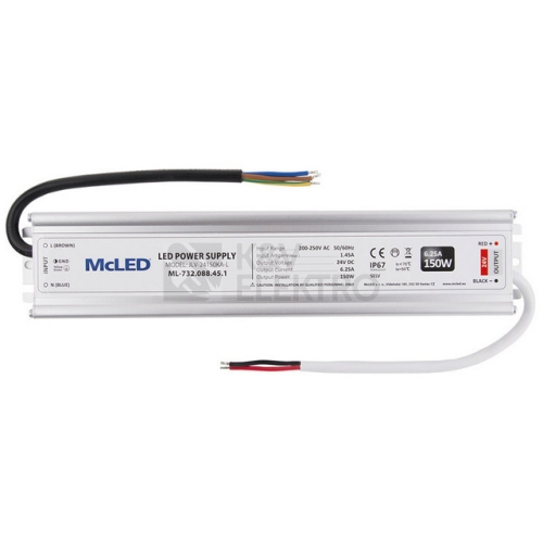 LED napěťový zdroj pro LED pásky 150W, IP67, výstup 24VDC, max. 6,25A. Vstup: 170-250VAC, 50-60Hz, účinnost > 87%, materiál krytu: hliník. Rozměry: 279x57x25mm, hmotnost: 0,68kg. Zdroj má 2 výstupy, každý zatížitelný max. 75W. Zdroj SELV. Při výběru zdroje počítejte s výkonovou rezervou min. 20%.