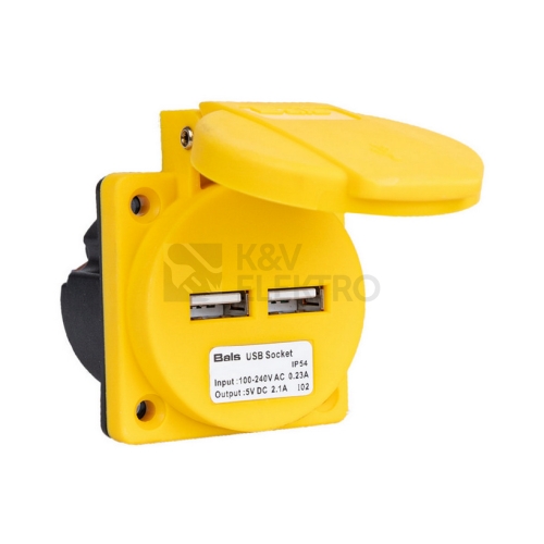 Zásuvka vestavná 2x USB typ A2,1A 5V IP54 vstup: 100 - 240V AC 0,23A kód barvy: žlutá RAL 1012 materiál krytu: polyamid barva: kryt žlutý, víčko sklopné žluté rozměry: výška 63.5 mm, šířka 50 mm, hloubka 47,5 mm rozměr příruby: svisle 50 mm, vodorovně 50 mm rozteč montážních otvorů: vodorovně 38 mm, svisle 38 mm další technické vlastnosti:připojení na zadní straně, integrovaná pojistka 250V / 3,15Asklopný kryt - polohování při otevření na 90°integrované odlehčení tahu připojovacího kabeludoporučujeme předřadit pojistku 1A