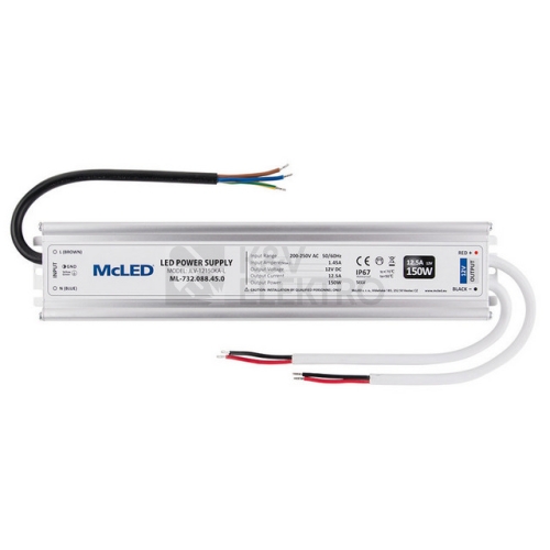 LED napěťový zdroj pro LED pásky 150W, IP67, výstup 12VDC, 12,5A. Vstup: 170-250VAC, 50-60Hz, účinnost > 87%, materiál krytu: hliník. Rozměry: 279x57x25mm, hmotnost: 0,68kg. Zdroj má 2 výstupy, každý zatížitelný max. 75W. Zdroj SELV. Při výběru zdroje počítejte s výkonovou rezervou min. 20%.