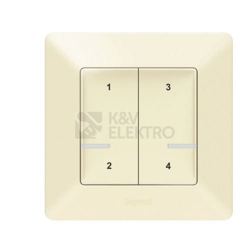 Valena Life with Netatmo bezdrátový ovládač scénářů "1-4" (baterie CR2032 a oboustranná lepenka součást balení), zadní strana je zcela plochá (lze montovat na zeď, sklo, nábytek pomocí šroubů nebo oboustranné lepenky), scénáře se nastavují pomocí aplikace Home + Control - barva Béžová, dodáván s rámečkem v barvě Béžová. Vyžaduje instalaci startovacího kitu nebo jiného komunikačního modulu/brány.