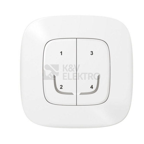 Valena Allure with Netatmo bezdrátový ovládač scénářů "1-4" (baterie CR2032 a oboustranná lepenka součást balení), zadní strana je zcela plochá (lze montovat na zeď, sklo, nábytek pomocí šroubů nebo oboustranné lepenky), scénáře se nastavují pomocí aplikace Home + Control - barva Bílá, dodáván s rámečkem v barvě Bílá. Vyžaduje instalaci startovacího kitu nebo jiného komunikačního modulu/brány.