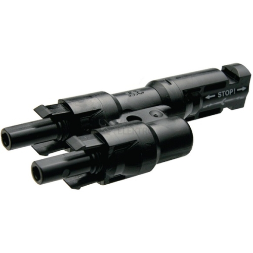 Slučovací konektor pro propojení fotovoltaických panelů se střídačem nebo pro propojení fotovoltaických panelů. Konektor je rozpojitelný a umožňuje provést dodatečné změny v zapojení fotovoltaického systému. Kompatibilní se solárními konektory Stäubli MC4 PV-KBT4 / KST4