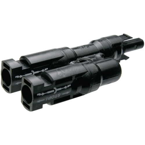 Slučovací konektor pro propojení fotovoltaických panelů se střídačem nebo pro propojení fotovoltaických panelů. Konektor je rozpojitelný a umožňuje provést dodatečné změny v zapojení fotovoltaického systému. Kompatibilní se solárními konektory Stäubli MC4 PV-KBT4 / KST4