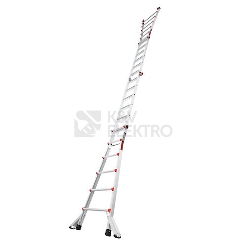 Žebřík vícepolohový výsuvný kloubový hliníkový s rozšířenou základnou, možnost až 6 pozic. Délka 396–701 cm, jako výsuvný až 767 cm