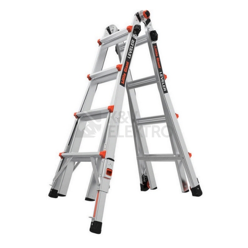 Žebřík vícepolohový výsuvný kloubový hliníkový s vyrovnávacími nohami, možnost až 7 pozic. Délka 274–457 cm, jako výsuvný až 523 cm