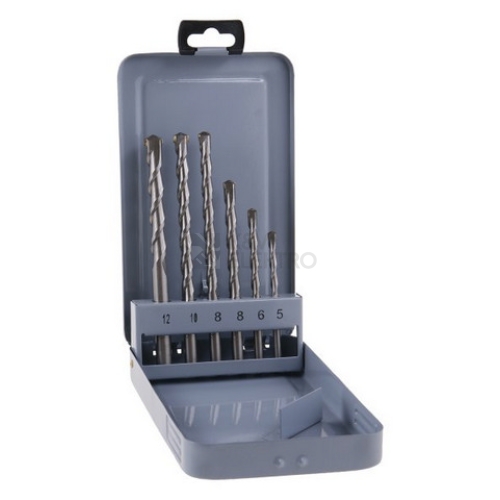 Sada kvalitních dvoubřitých vrtáků 5, 6, 8, 10, 12 mm, válcová stopka přesně uložené plátky ze slinutých karbidů (vysoké tvrdosti), uchyceny pájením při teplotě přes 1000°C - pro lepší snášení vysokých teplot při vrtání speciální tvar šroubovice vrtáku zajišťuje dobrý odvod odvrtaného materiálu z otvoru - rychlé, přesné a výkonné vrtání použití - pro příklepové vrtání mramoru, kamene, keramiky, cihel, betonu, zdiva aj. balení - plechová krabička s eurozávěsem