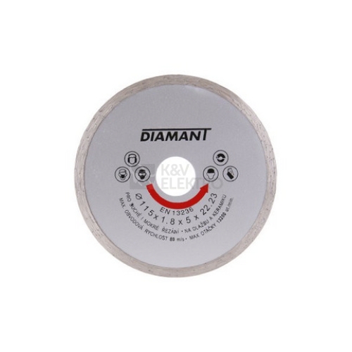 Diamantový kotouč DIAMANT, provedení : PLNÝ - celoobvodový, kvalitní diamantová vrstva s vysokým obsahem diamantového prachu, přesné zpracování - napojení na nosný disk kotouče odolávající vysokým teplotám, použití : určený pro mokré i suché řezání dlažby a obkladů, betonu, cihel, zdiva, žuly, mramoru, kamene, skla, keramiky, balení : blistr s eurootvorem, přiložen redukční kroužek z 22,2 na 20 mm, rozměry : uvedeny v názvu výrobku.